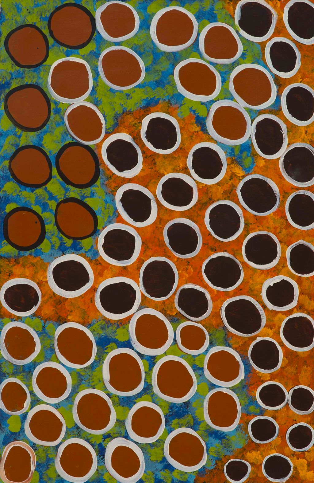 This work depicts a linyji (claypan) within the artists’ ngurra (home Country, camp), typically represented with circular forms. Claypans were visited more often during the wet seasons as they filled with water.