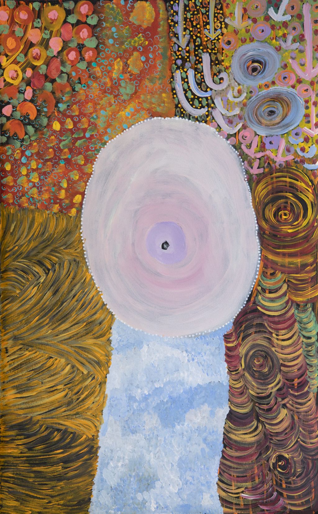 This is Dale’s Country- her ‘ngurra’ (home Country, camp). People identify with their ngurra in terms of specific rights and responsibilities, and the possession of intimate knowledge of the physical and cultural properties of one’s Country. Painting ngurra, and in so doing sharing the Jukurrpa (Dreaming) stories and physical characteristics of that place, has today become an important means of cultural maintenance. Dale’s ngurra encompasses her birthplace, Jigalong, and the Country that her family walked in the pujiman (traditional, desert-dwelling) era, including Puntawarri, Raarki (Canning Stock Route Well 27), Kularti, Kumpupirntily , Mirtikanya, (Kumpupintily, Lake Disappointment), and Mukurtu.