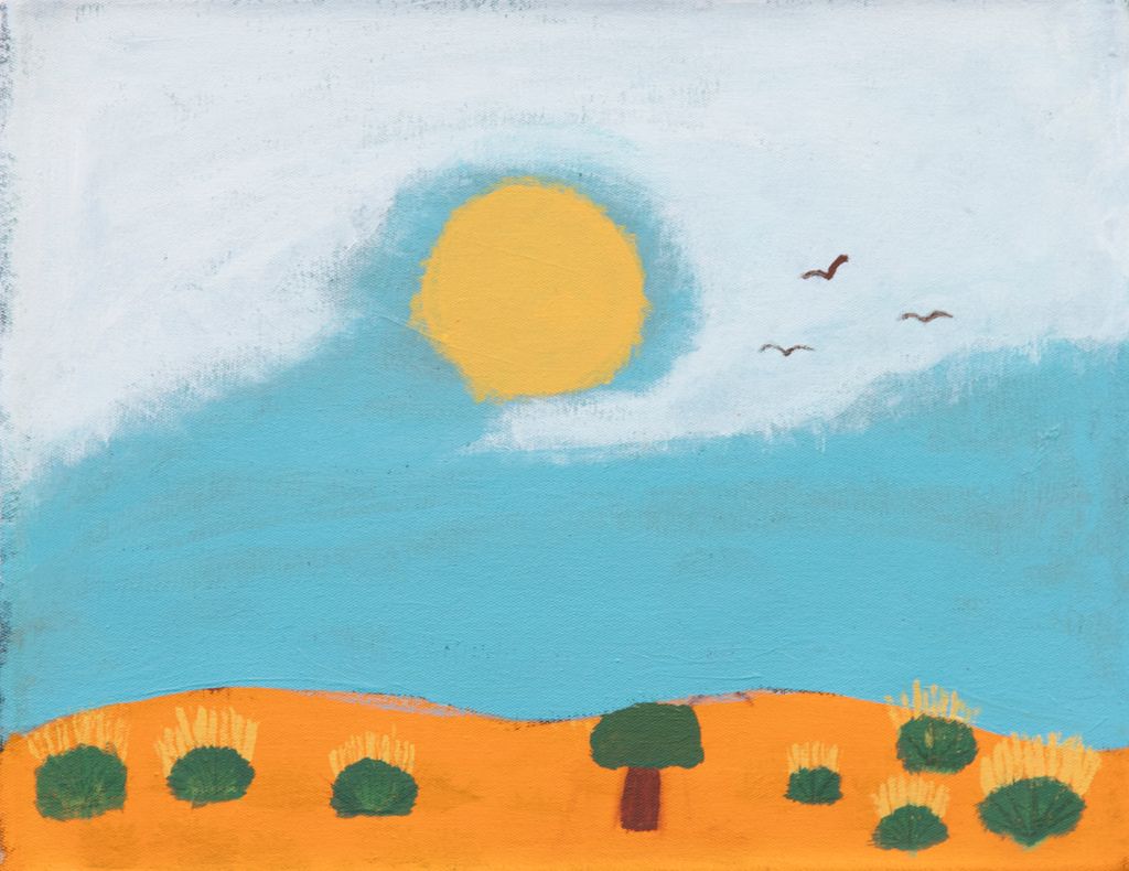 Also visible may be traces of life cycles based around kalyu (rain, water) and waru (fire). A thousands of year old practice, fire burning continues to be carried out as both an aid for hunting and a means of land management today. As the Martu travelled and hunted they would burn tracts of land, ensuring plant and animal biodiversity and reducing the risk of unmanageable, spontaneous bush fires. The patchwork nature of regrowth is visible in many landscape works, with each of the five distinctive phases of fire burning visually described with respect to the cycle of burning and regrowth.