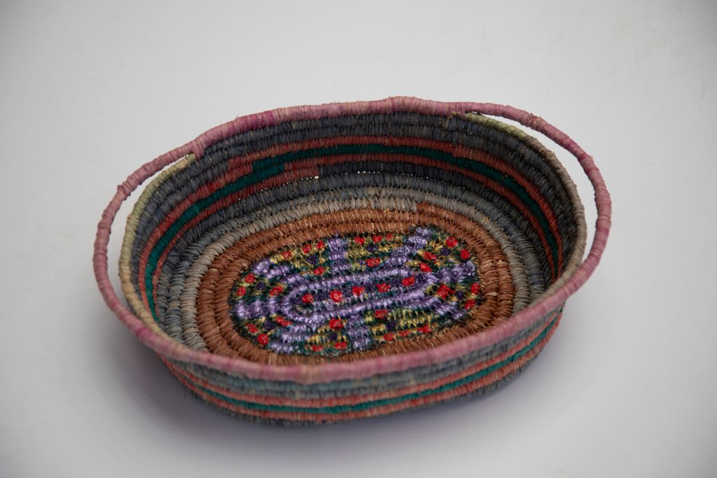 Each basket is built up through wrapping fine bundles of grass in brightly coloured wool and then stitching each round on to the previous one. The baskets are primarily made from puntayarra and minarri (Amphipogon Caricinus) grass, usually collected incidentally during trips to visit family, attend ceremonies, maintain Country, and hunt and gather bush tucker. Martu artists have developed a distinctive style of basketry and individual artists continue to develop new designs and incorporate novel materials, including steel, wire and wood, into their work.