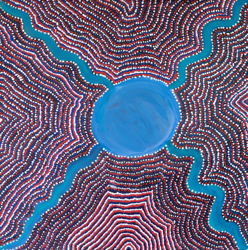 This painting portrays one of the annual football carnivals in Martu Community. Each of the remote communities has a football team, and every year a different community is chosen as host to the carnival. Blue, red and white are the colours of the Punmu Bulldog’s, the team of Debra’s ngurra (home Country, camp). The carnivals are important social events, and present a chance to catch up with friends and family members. Everyone travels long distances to support the players and celebrate together.