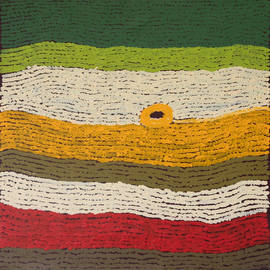 This is Mayiwalku’s Country- her ‘ngurra’ (home Country, camp). People identify with their ngurra in terms of specific rights and responsibilities, and the possession of intimate knowledge of the physical and cultural properties of one’s Country. Painting ngurra, and in so doing sharing the Jukurrpa (Dreaming) stories and physical characteristics of that place, has today become an important means of cultural maintenance.