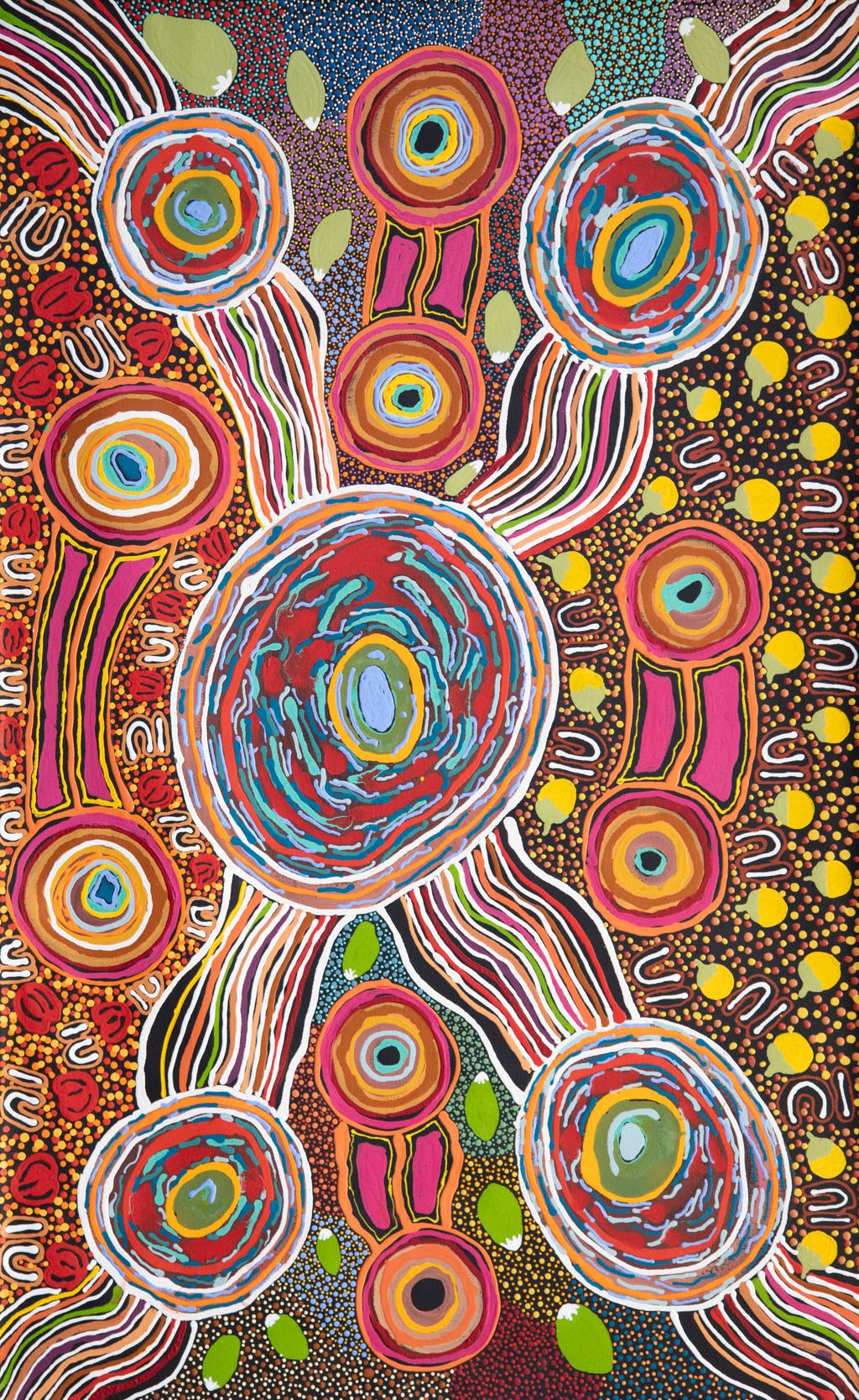 In this work Marlene depicts a waterhole and rock hole located in Mungili, the small outstation community located just off the Eagle Highway in Western Australia, approximately 430 kilometres northeast of Wiluna and 250 kilometres north of Warburton. Marlene grew up in Mungili, and as such it forms a significant part of her ‘ngurra’ (home Country, camp). Typically Marlene depicts this site with a central large circular form that represents the main waterhole, surrounded by smaller circular forms representing satellite water bodies.