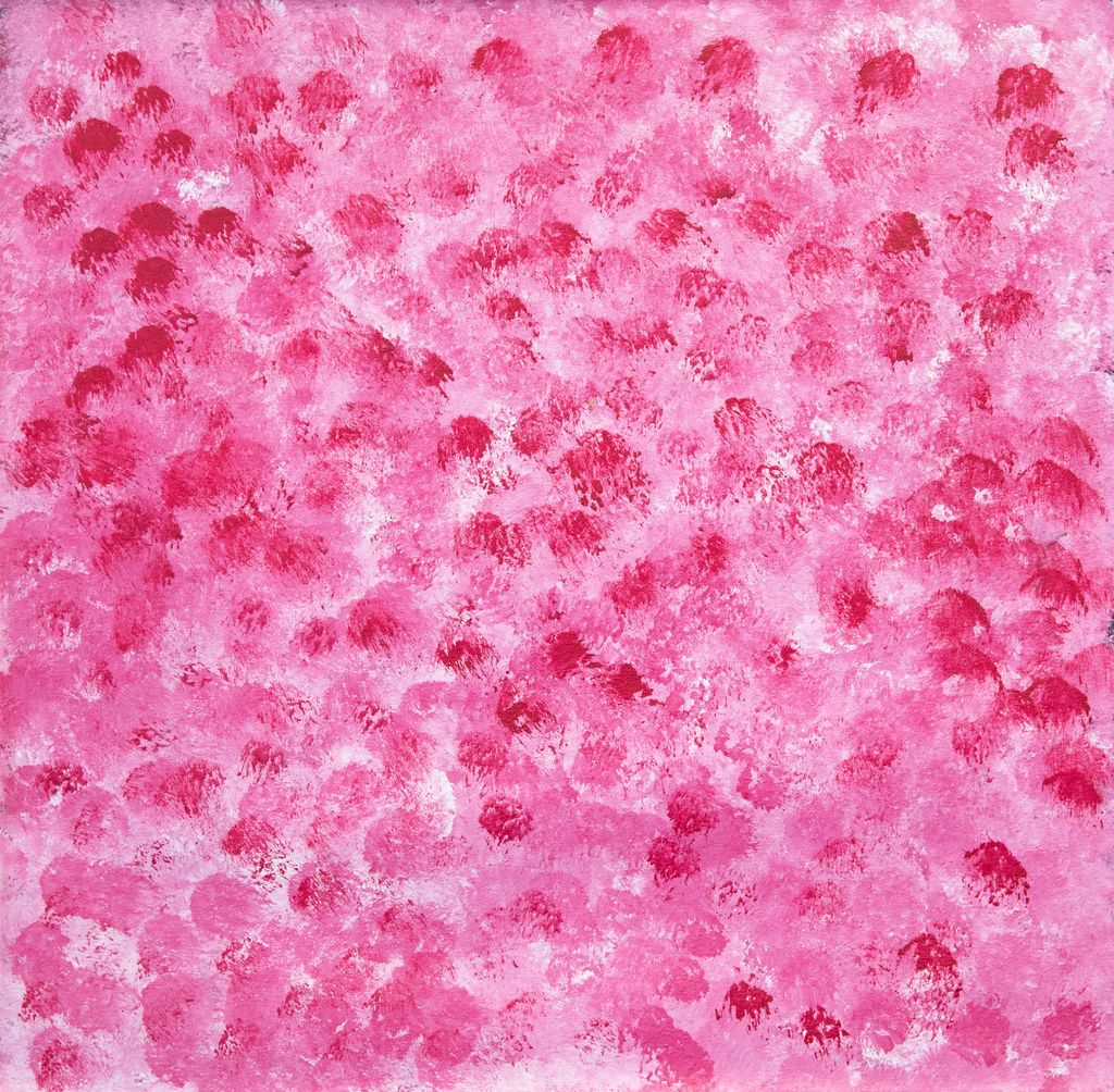 This work depicts a warla (lake) within the artists’ ngurra (home Country, camp), typically represented with circular forms. As a reliable source of water in the often harsh and arid Martu lands, warla represented important sites not only for camping throughout the year, but also in terms of their creation as described through Jukurrpa (dreaming) narratives.