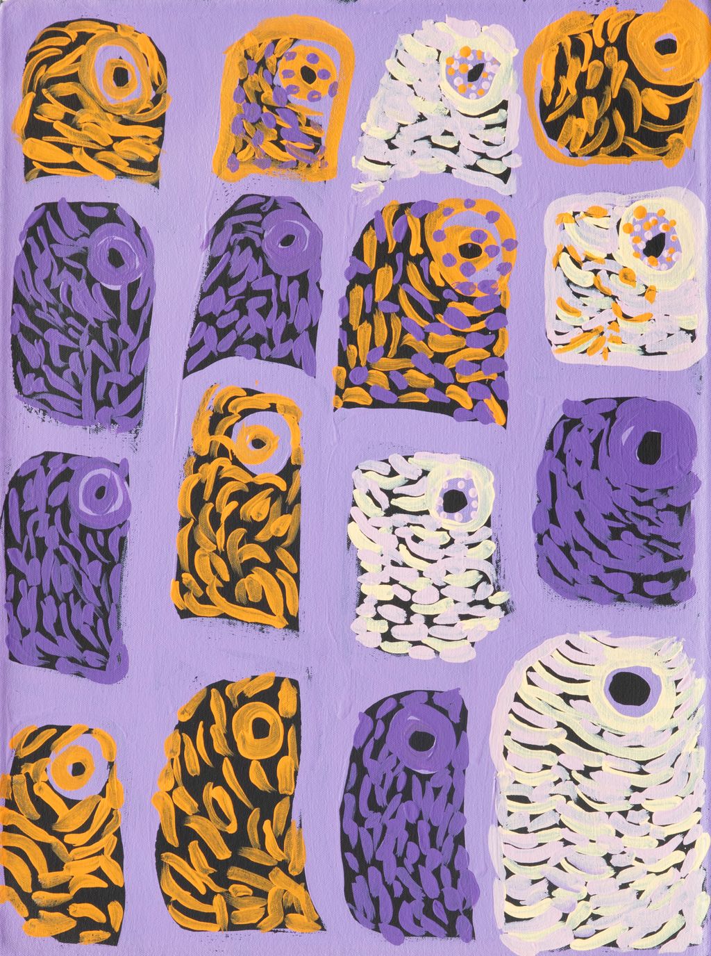 This is Lorna’s Country- her ‘ngurra’ (home Country, camp). People identify with their ngurra in terms of specific rights and responsibilities, and the possession of intimate knowledge of the physical and cultural properties of one’s Country. Painting ngurra, and in so doing sharing the Jukurrpa (Dreaming) stories and physical characteristics of that place, has today become an important means of cultural maintenance.