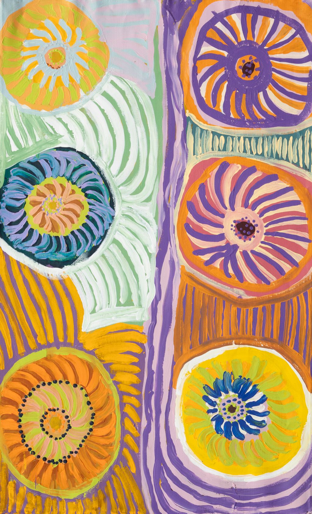 This is Lorna’s Country- her ‘ngurra’ (home Country, camp). People identify with their ngurra in terms of specific rights and responsibilities, and the possession of intimate knowledge of the physical and cultural properties of one’s Country. Painting ngurra, and in so doing sharing the Jukurrpa (Dreaming) stories and physical characteristics of that place, has today become an important means of cultural maintenance.
