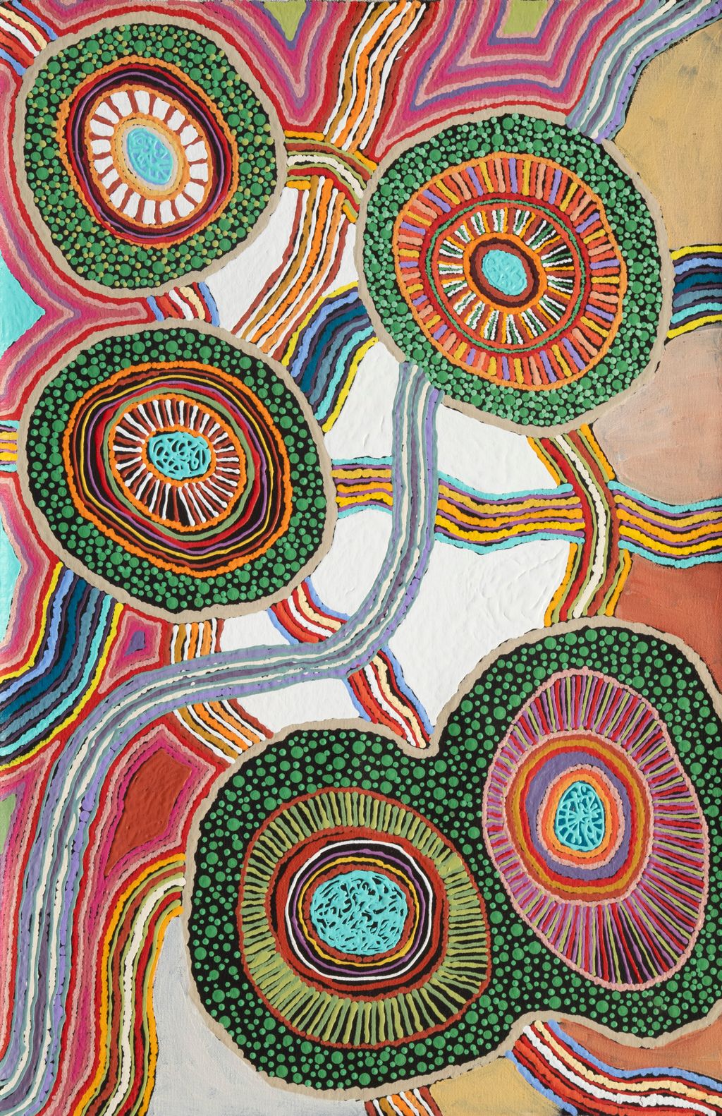 In this work Marlene depicts a waterhole and rock hole located in Mungili, the small outstation community located just off the Eagle Highway in Western Australia, approximately 430 kilometres northeast of Wiluna and 250 kilometres north of Warburton. Marlene grew up in Mungili, and as such it forms a significant part of her ‘ngurra’ (home Country, camp). Typically Marlene depicts this site with a central large circular form that represents the main waterhole, surrounded by smaller circular forms representing satellite water bodies.