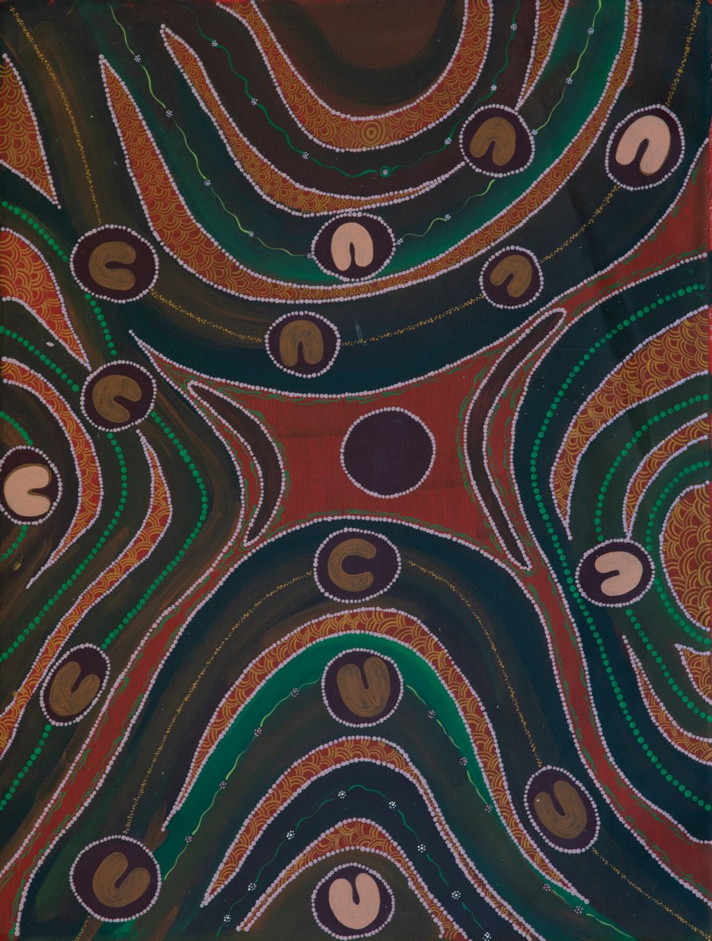 In this artwork Roxanne illustrated the transfer of knowledge from elders to younger Martu generations. During the pujiman (traditional, desert dwelling) period, Martu would traverse vast distances annually in small family groups, moving seasonally from water source to water source and hunting and gathering bush tucker as they went. Although desert life has moved away from mobile hunter-gatherer subsistence throughout the course of the twentieth century, bush tucker remains a significant component of the modern Martu diet and continues to play a crucial role in passing down cultural knowledge.