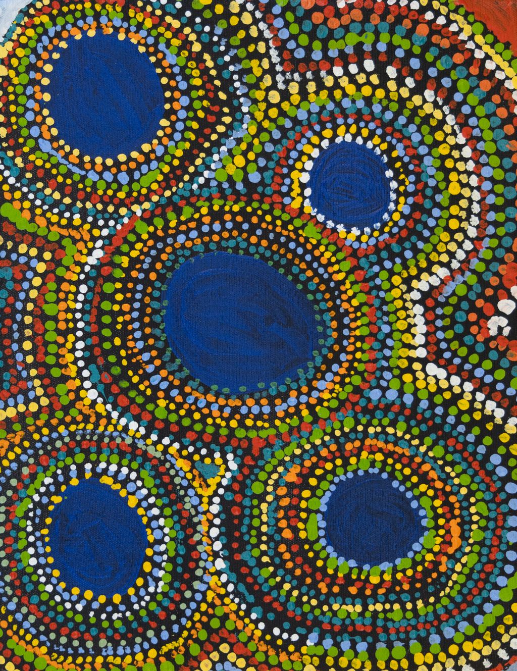 Wirlarra, the site depicted in this painting, lies on the eastern edge of a large salt lake, Nyayartakujarra (Lake Dora), near Punmu Aboriginal community. A distinctive group of small salt water pools are clustered together here. The water from these pools is known for its’ powerful healing properties, and the pools are still visited today by Martu to bathe cuts and sores.