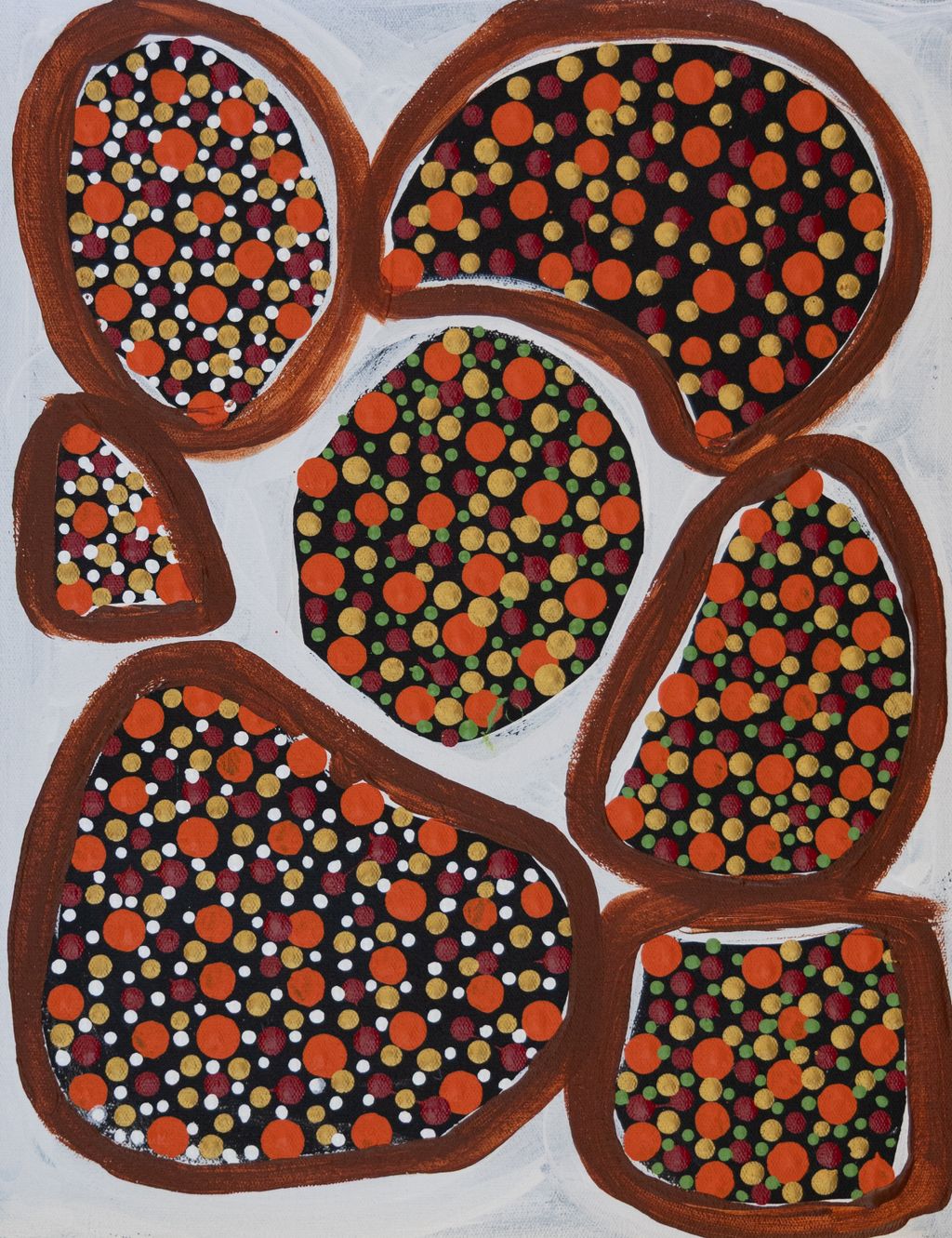 This work depicts a linyji (claypan) within the artists’ ngurra (home Country, camp), typically represented with circular forms. Claypans were visited more often during the wet seasons as they filled with water. As Kuru here describes, besides being a valuable water source, claypans were also ingeniously utilized for the removal of husks from seeds before consumption. Additionally, the clay itself was applied topically for its healing properties, aiding in the treatment of burns and soothing headaches.