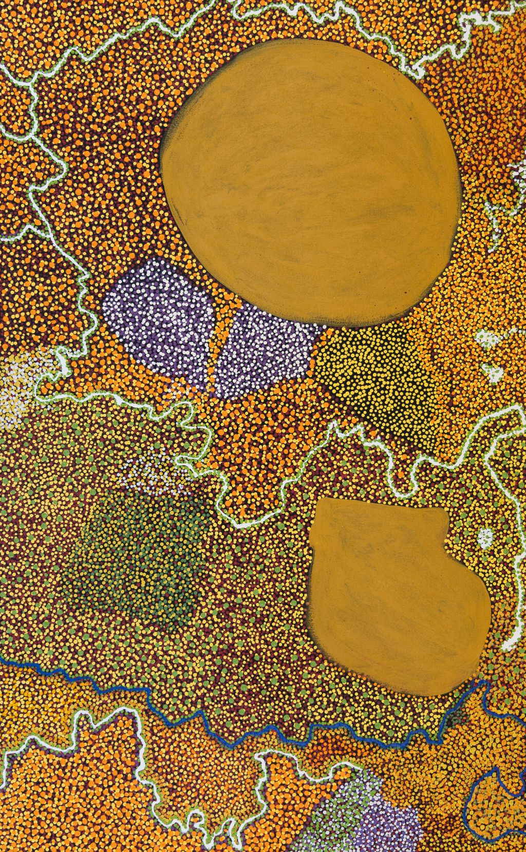 This site lies within Nyanjilpayi’s ngurra (home Country, camp) through her uncle and grandmother, and forms part of the area which she knew intimately and travelled extensively in her youth. The Western Desert term ‘ngurra’ is hugely versatile in application. Broadly denoting birthplace and belonging, ngurra can refer to a body of water, a camp site, a large area of Country, or even a modern house. People identify with their ngurra in terms of specific rights and responsibilities, and the possession of intimate knowledge of the physical and cultural properties of one’s Country. This knowledge is traditionally passed intergenerationally through family connections. Painting ngurra, and in so doing sharing the Jukurrpa (Dreaming) stories and physical characteristics of that place, has today become an important means of cultural maintenance. Physical maintenance of one’s ngurra, like cultural maintenance, ensures a site’s wellbeing, and is a responsibility of the people belonging to that area.