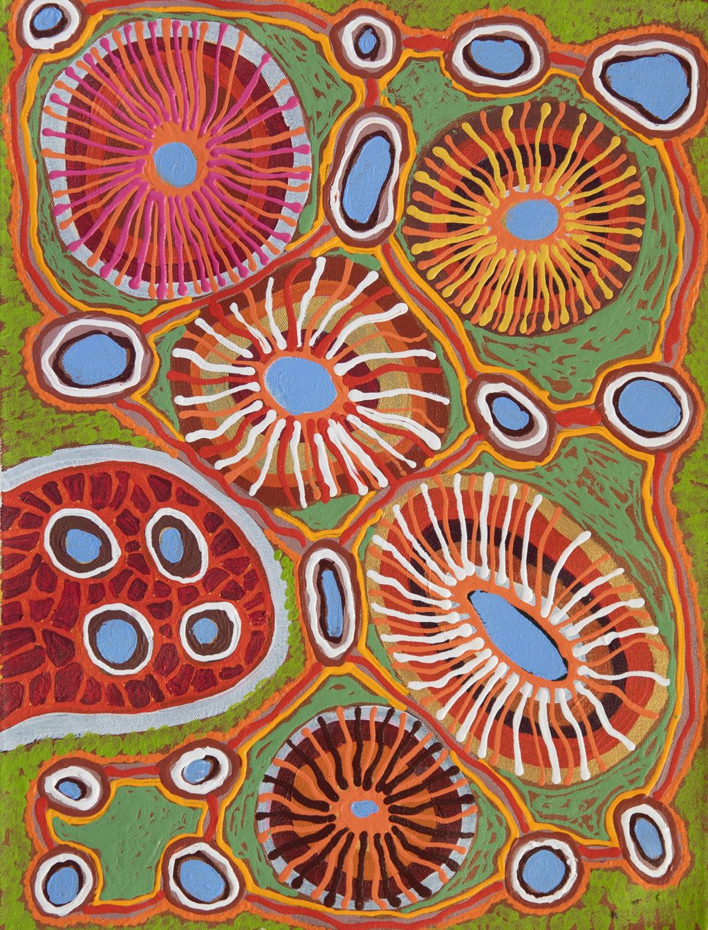 In this work Marlene depicts a waterhole and rock hole located in Mungili, the small outstation community located just off the Eagle Highway in Western Australia, approximately 430 kilometres northeast of Wiluna and 250 kilometres north of Warburton. Marlene grew up in Mungili, and as such it forms a significant part of her ‘ngurra’ (home Country, camp). Typically Marlene depicts this site with a central large circular form that represents the main waterhole, surrounded by smaller circular forms representing satellite water bodies.