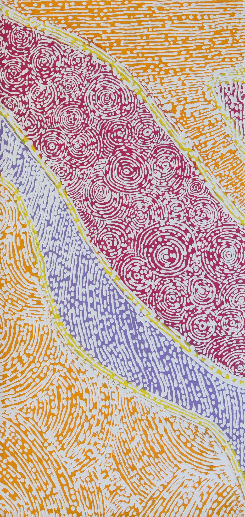 Younger Martu artists often start painting alongside their parents, grandparents, and extended family, which fosters an organic learning process. This not only involves mastering painting techniques but also understanding specific locations, family histories, traditional ways of life, bush tucker, and Jukurrpa (Dreaming). Over time, with encouragement from their peers, they develop their own distinct styles and explore unique painting techniques and subject matter. In this work the artist brings a contemporary, evolving perspective to their work.