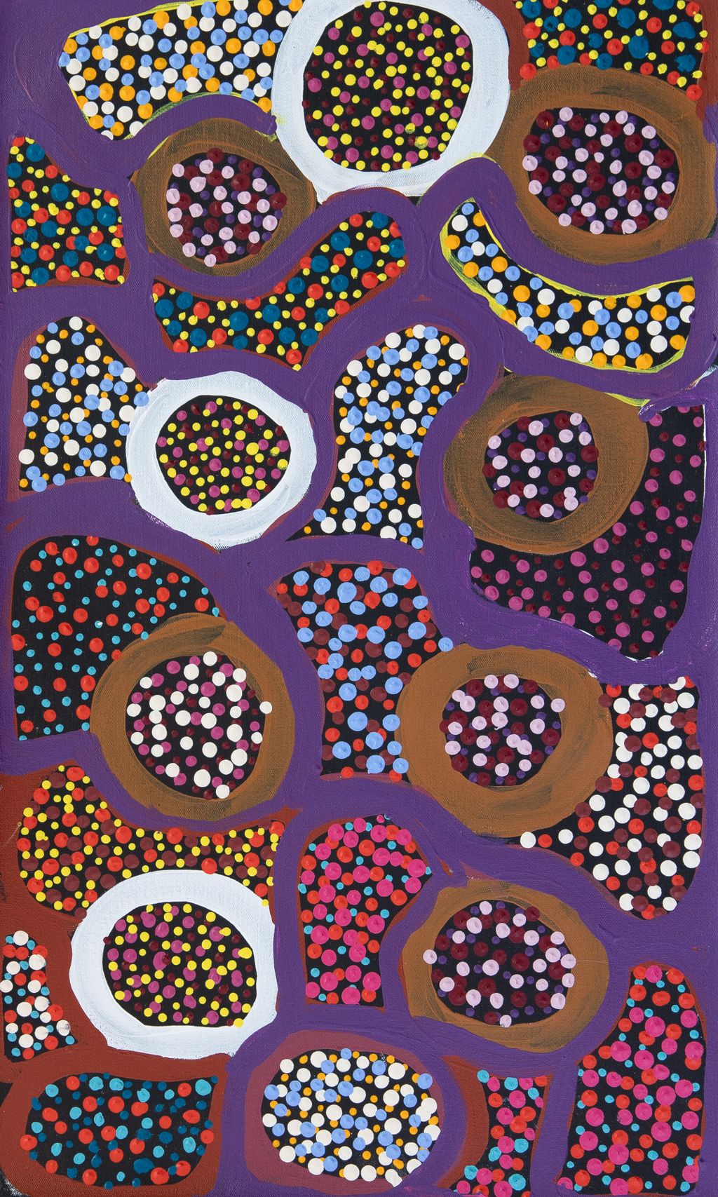 This work depicts a linyji (claypan) within the artists’ ngurra (home Country, camp), typically represented with circular forms. Claypans were visited more often during the wet seasons as they filled with water. As Kuru here describes, besides being a valuable water source, claypans were also ingeniously utilized for the removal of husks from seeds before consumption. Additionally, the clay itself was applied topically for its healing properties, aiding in the treatment of burns and soothing headaches.