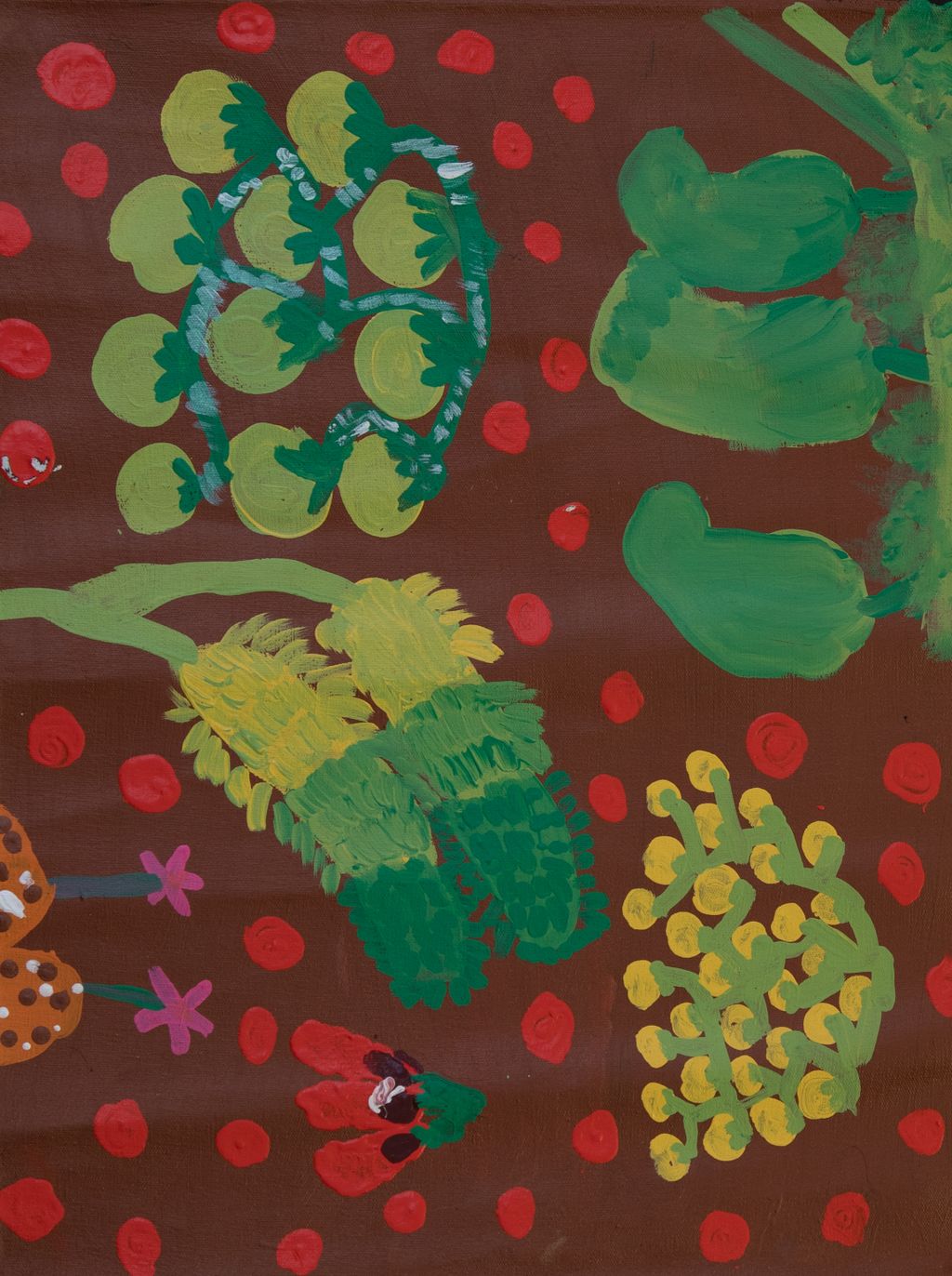 Depicted in this work are traditional types of bush tucker, their habitats, and their related hunting and gathering methods. During the pujiman (traditional, desert dwelling) period, Martu would traverse very large distances annually in small family groups, moving seasonally from water source to water source, and hunting and gathering bush tucker as they went. Whilst desert life has moved away from mobile hunter-gatherer subsistence throughout the course of the twentieth century, bush tucker continues to be a significant component of the modern Martu diet. Hunting and gathering bush tucker remains equally valuable as an important cultural practice that is passed on intergenerationally. Though hunting and gathering implements have been modernised, methods of harvesting, tracking and the use of fire burning to drive animals from their retreats are still commonly practiced today.