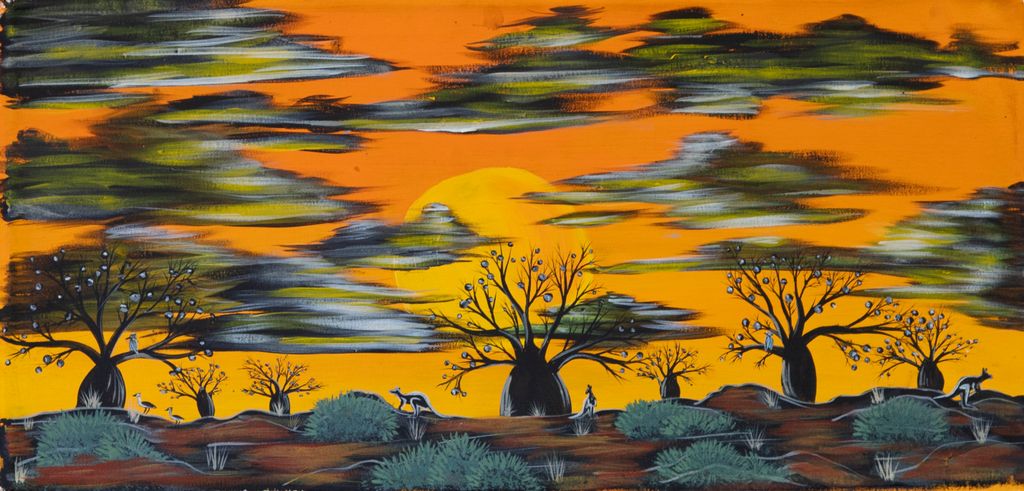 Also visible may be traces of life cycles based around kalyu (rain, water) and waru (fire). A thousands of year old practice, fire burning continues to be carried out as both an aid for hunting and a means of land management today. As the Martu travelled and hunted they would burn tracts of land, ensuring plant and animal biodiversity and reducing the risk of unmanageable, spontaneous bush fires. The patchwork nature of regrowth is visible in many landscape works, with each of the five distinctive phases of fire burning visually described with respect to the cycle of burning and regrowth.
