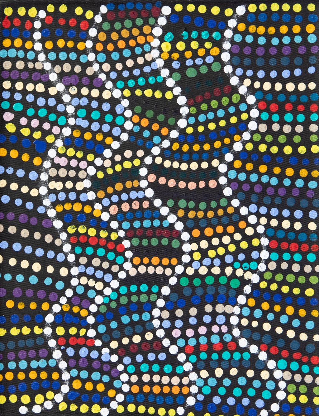 Younger Martu artists often start painting alongside their parents, grandparents, and extended family, which fosters an organic learning process. This not only involves mastering painting techniques but also understanding specific locations, family histories, traditional ways of life, bush tucker, and Jukurrpa (Dreaming). Over time, with encouragement from their peers, they develop their own distinct styles and explore unique painting techniques and subject matter. In this work the artist brings a contemporary, evolving perspective to their work.