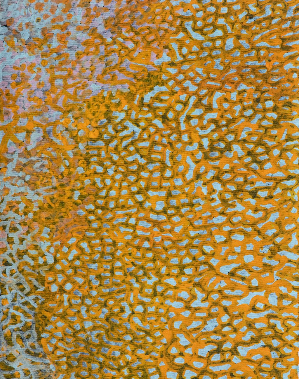 Muuki paints Kulyakartu in all its different seasonal stages. Often visible in his work is the patchwork nature of regrowth subsequent to the practice of waru (fire) burning that assists with hunting, regenerates growth, and encourages greater diversity in plant and animal life. This mosaic patterning is aligned with the five distinct Martu cyclical phases of burning and regrowth. First is nyurnma (freshly burnt Country) when Muuki is “making waru”. Following nyurnma are the rains and subsequent waru-waru, when young, bright green plants start to grow. Nyukura occurs between one and three years after burning, when plants have matured and are fruiting and seeding. Manguu is “when him finished”, four to six years post burning, and when spinifex has matured to the point that it can be burned once again. Finally, kunarka signifies the time when spinifex and other plant species have become old growth, and pose a risk of destructive bushfires.