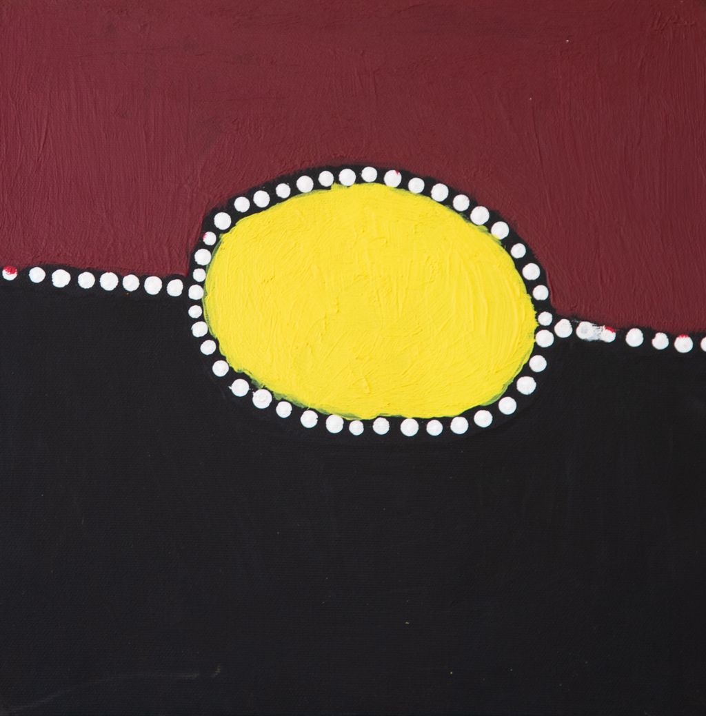 Younger Martu artists often start painting alongside their parents, grandparents, and extended family, which fosters an organic learning process. This not only involves mastering painting techniques but also understanding specific locations, family histories, traditional ways of life, bush tucker, and Jukurrpa (Dreaming). Over time, with encouragement from their peers, they develop their own distinct styles and explore unique painting techniques and subject matter. In this work the artist brings a contemporary, evolving perspective to their work.