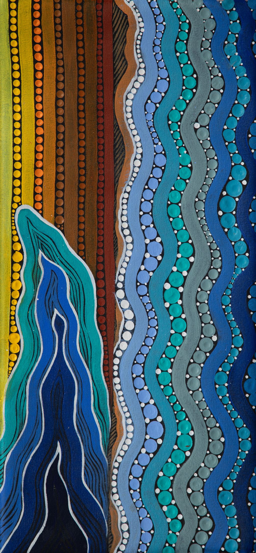 Younger Martu artists often start painting alongside their parents, grandparents, and extended family, which fosters an organic learning process. This not only involves mastering painting techniques but also understanding specific locations, family histories, traditional ways of life, bush tucker, and Jukurrpa (Dreaming). Over time, with encouragement from their peers, they develop their own distinct styles and explore unique painting techniques and subject matter. In this work the artist brings a contemporary, evolving perspective to their work.