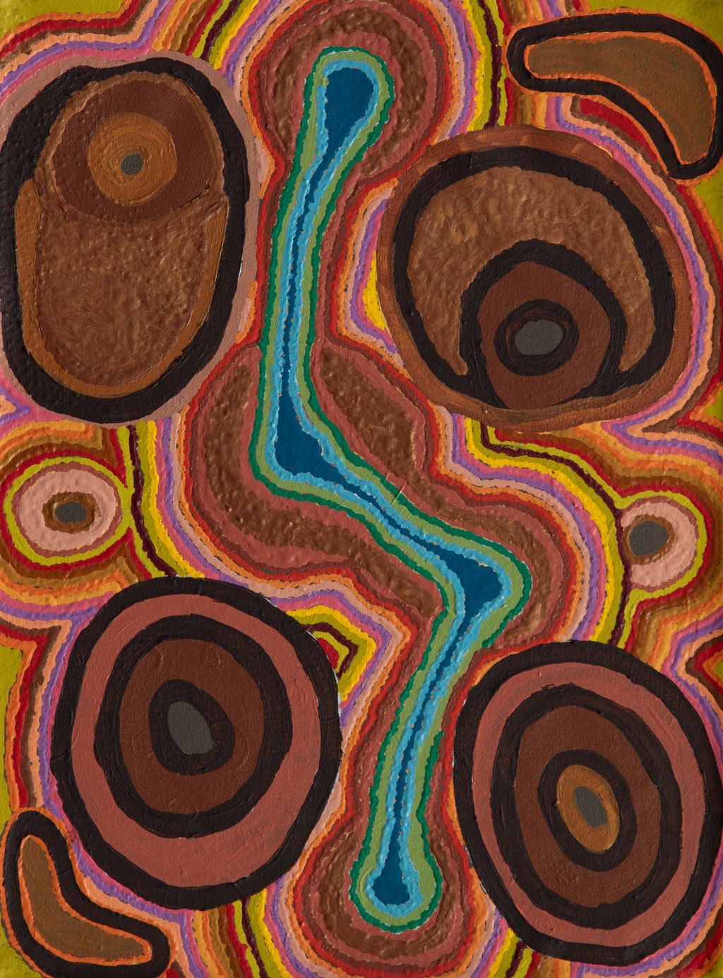 In this work Marlene depicts a waterhole and rock hole located in Mungili, the small outstation community located just off the Eagle Highway in Western Australia, approximately 430 kilometres northeast of Wiluna and 250 kilometres north of Warburton. Marlene grew up in Mungili, and as such it forms a significant part of her ‘ngurra’ (home Country, camp). Typically Marlene depicts this site with a central large circular form that represents the main waterhole, surrounded by smaller circular forms representing satellite water bodies.