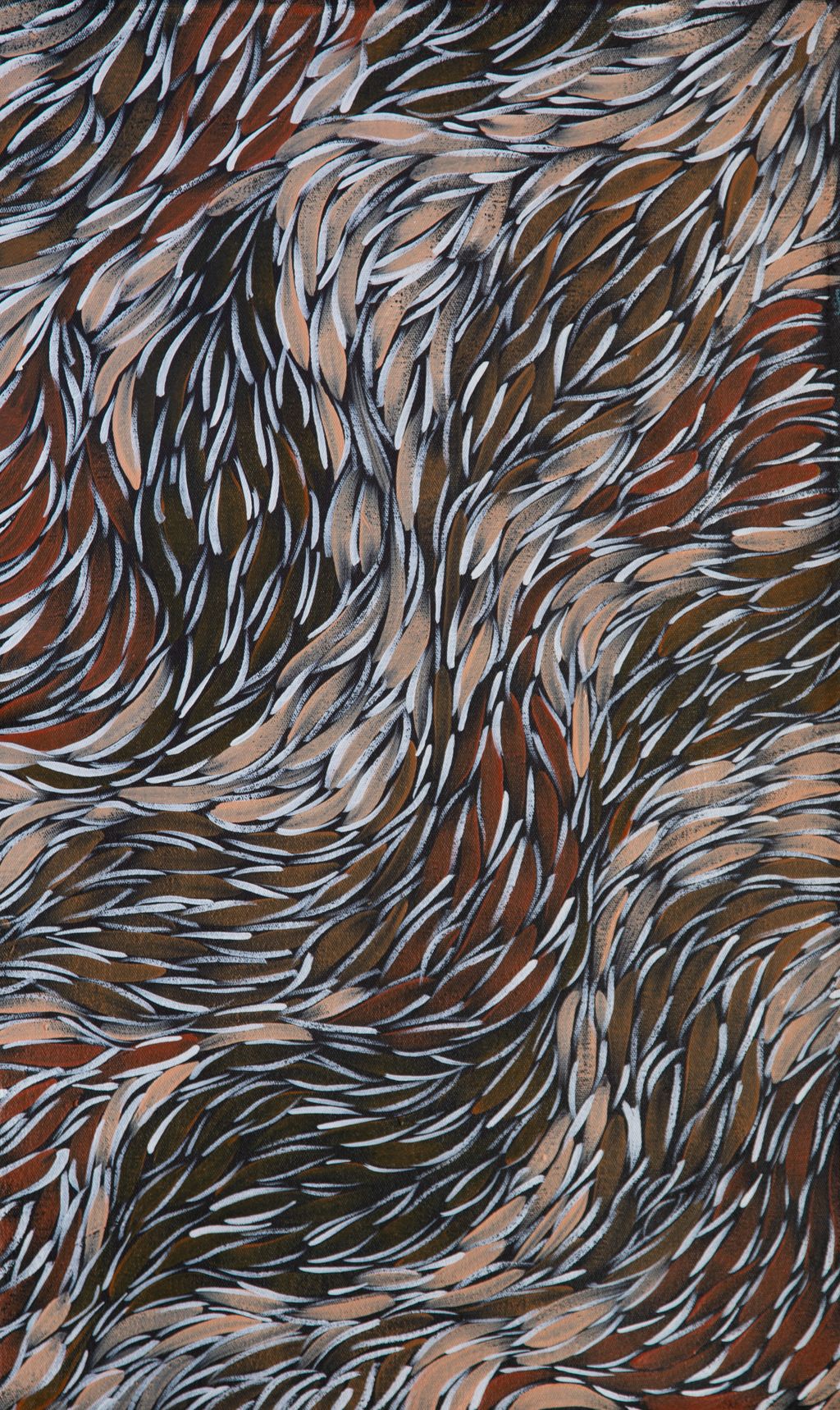 An additional layer of meaning in the work relates to more intangible concepts; life cycles based around kalyu (rain, water) and waru (fire) are also often evident. A thousands of year old practice, fire burning continues to be carried out as both an aid for hunting and a means of land management today. As the Martu travelled and hunted they would burn tracts of land, ensuring plant and animal biodiversity and reducing the risk of unmanageable, spontaneous bush fires. The patchwork nature of regrowth is evident in many landscape works, with each of the five distinctive phases of fire burning visually described with respect to the cycle of burning and regrowth.