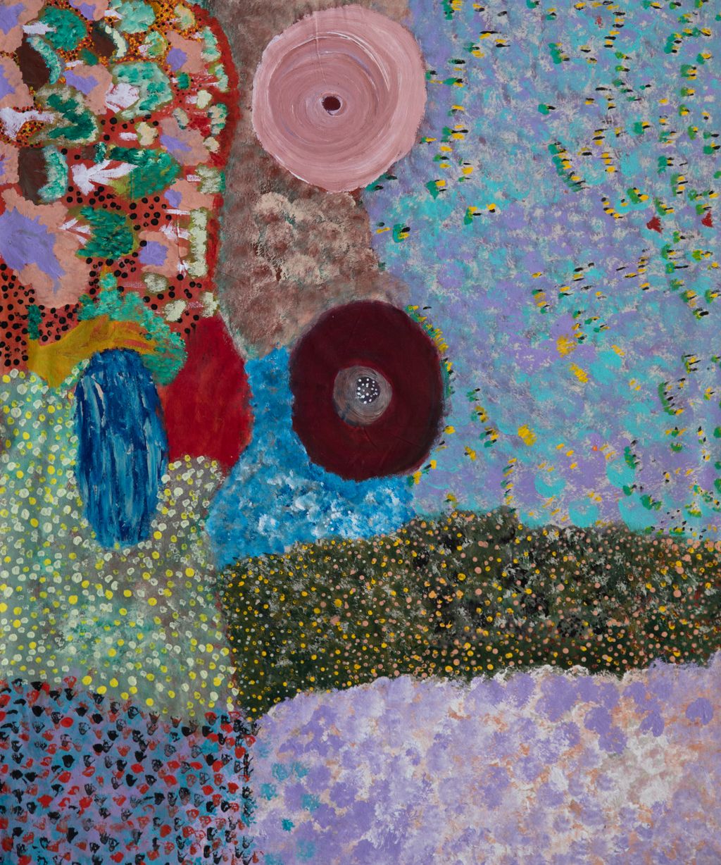 This is Dale’s Country- her ‘ngurra’ (home Country, camp). People identify with their ngurra in terms of specific rights and responsibilities, and the possession of intimate knowledge of the physical and cultural properties of one’s Country. Painting ngurra, and in so doing sharing the Jukurrpa (Dreaming) stories and physical characteristics of that place, has today become an important means of cultural maintenance. Dale’s ngurra encompasses her birthplace, Jigalong, and the Country that her family walked in the pujiman (traditional, desert-dwelling) era, including Puntawarri, Raarki (Canning Stock Route Well 27), Kularti, Kumpupirntily , Mirtikanya, (Kumpupintily, Lake Disappointment), and Mukurtu.