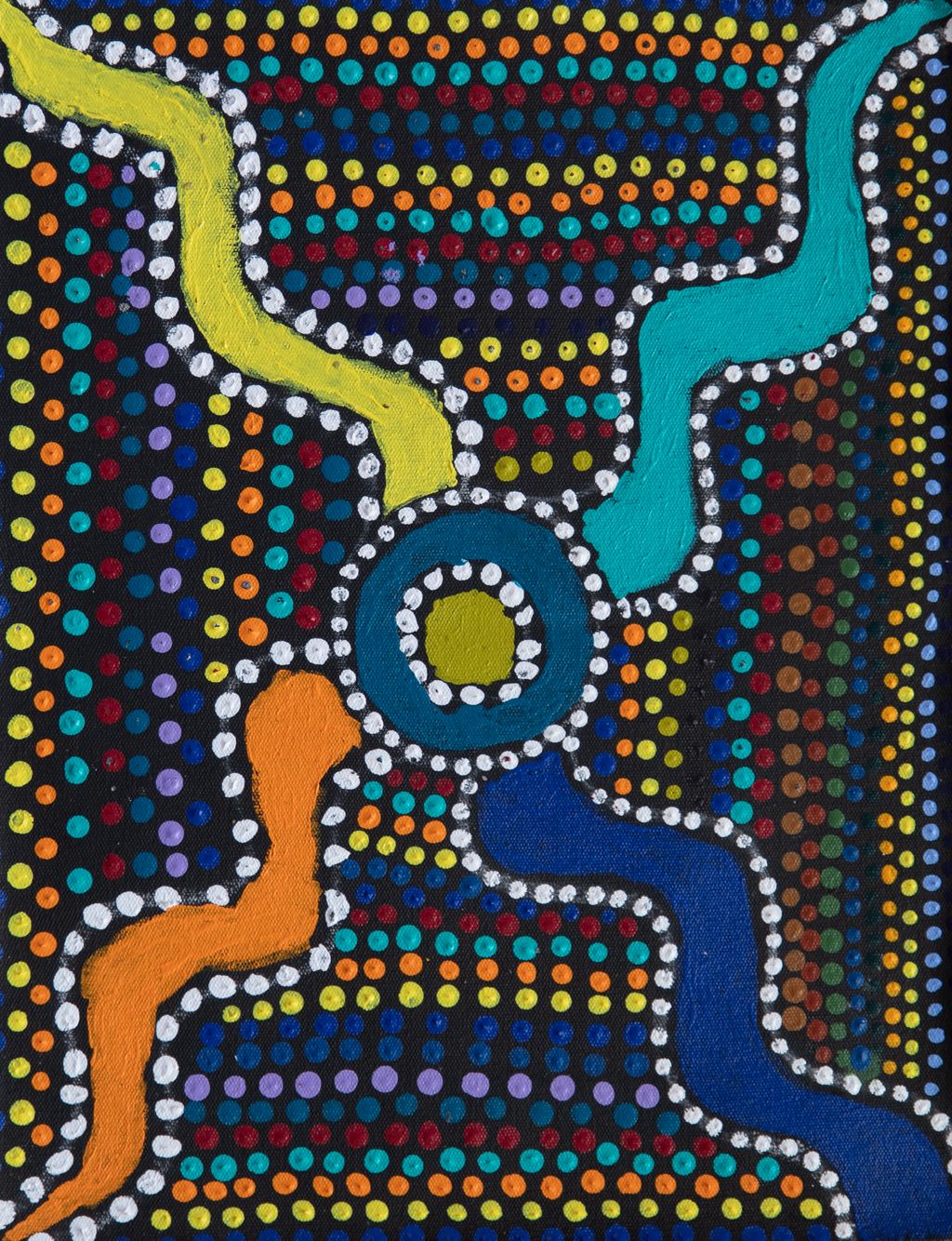 Younger Martu artists often start painting alongside their parents, grandparents, and extended family, which fosters an organic learning process. This not only involves mastering painting techniques but also understanding specific locations, family histories, traditional ways of life, bush tucker, and Jukurrpa (Dreaming). Over time, with encouragement from their peers, they develop their own distinct styles and explore unique painting techniques and subject matter. In this work the artist brings a contemporary, evolving perspective to their work.
